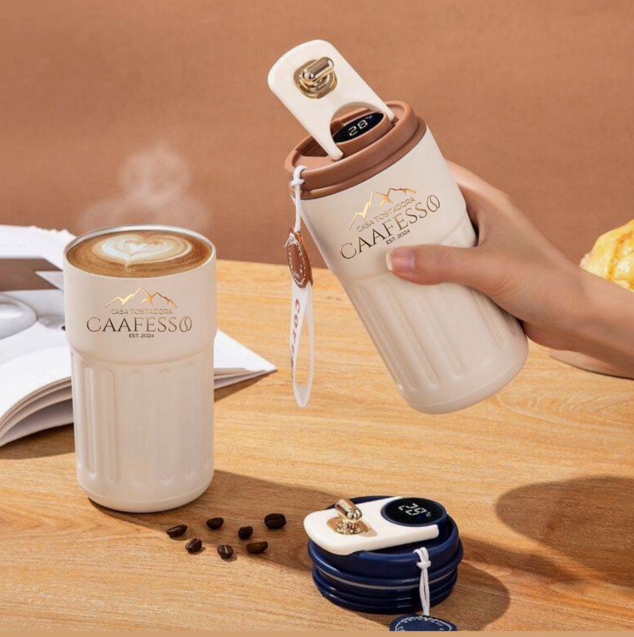Mantén tu café a la temperatura ideal con esta taza térmica portátil de 450ml equipada con una pantalla digital LED que muestra en tiempo real la temperatura de tu bebida. Fabricada con acero inoxidable de alta resistencia, es perfecta para llevar tu Café Caafesso recién hecho a donde vayas.
